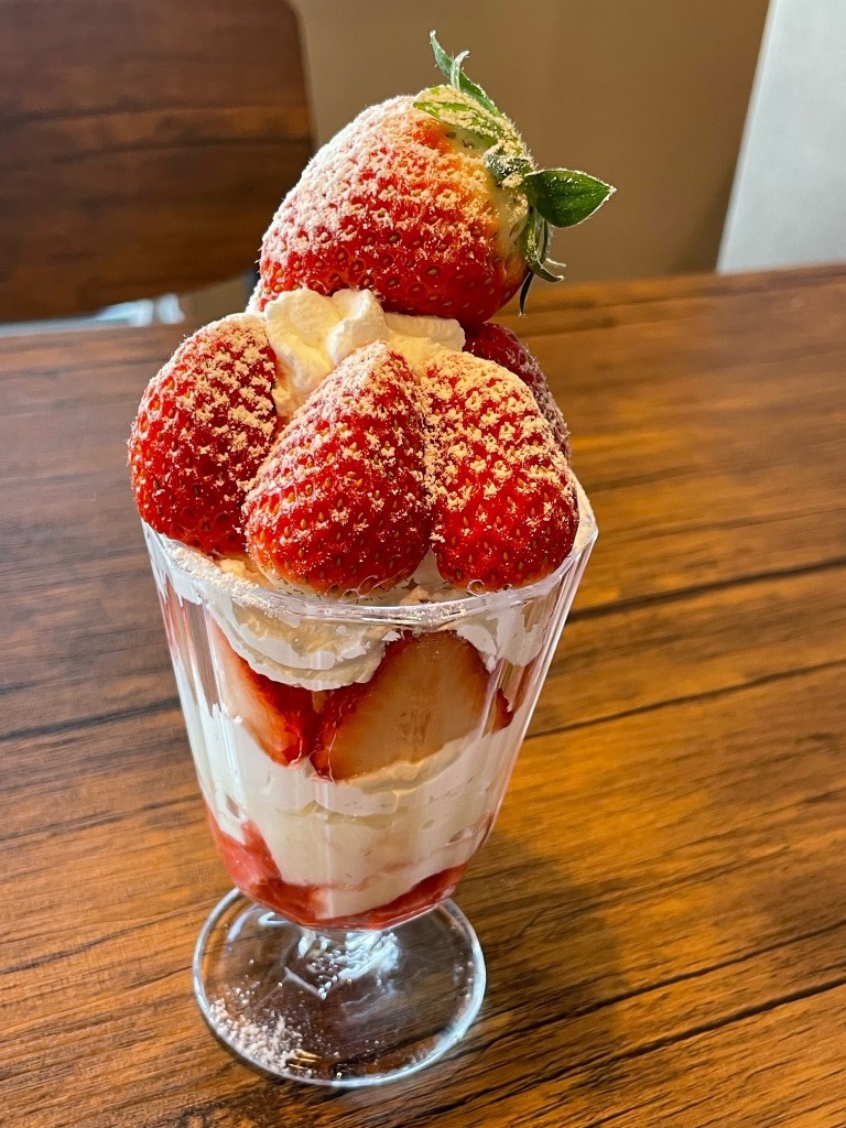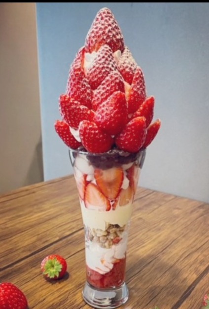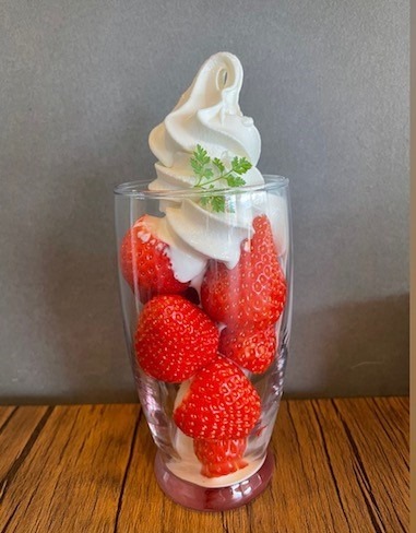 自社栽培の朝採れいちごをふんだんに使用したパフェになります♪
